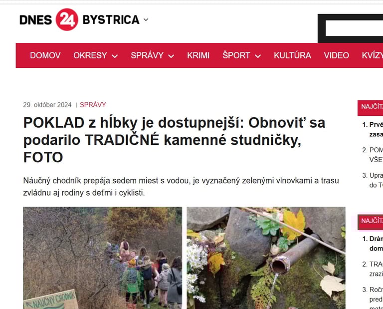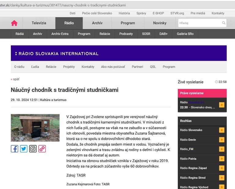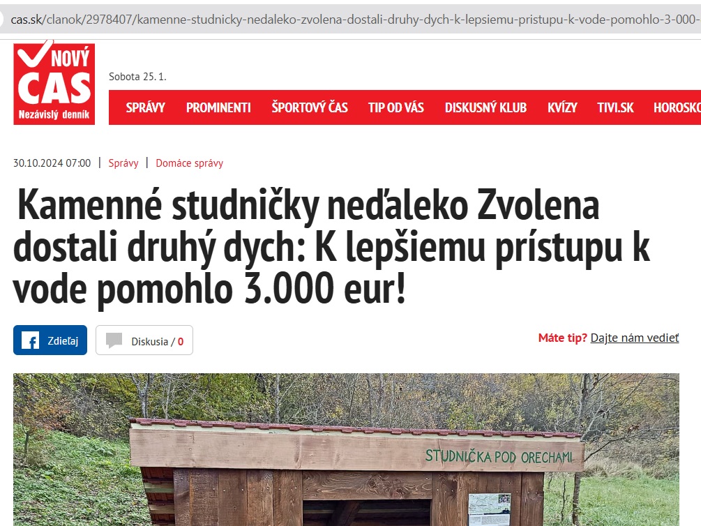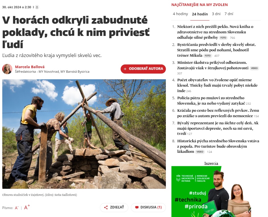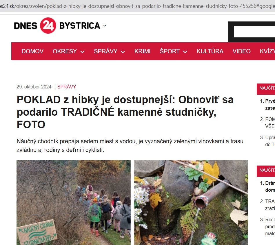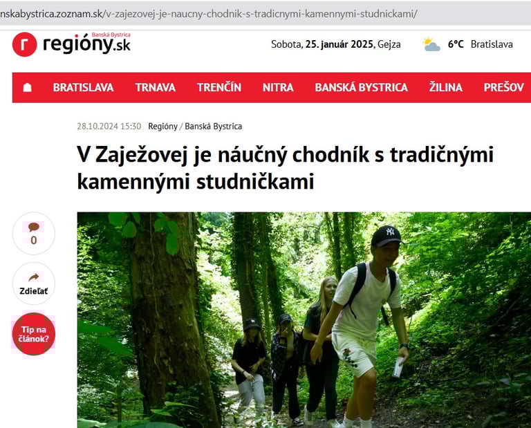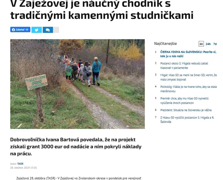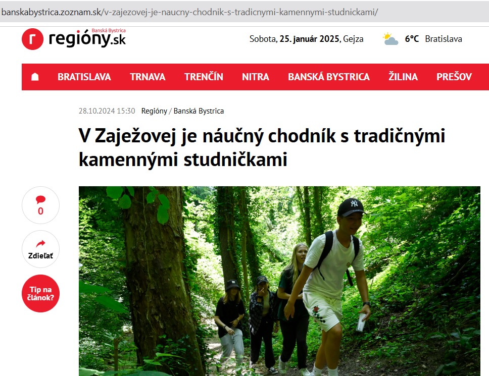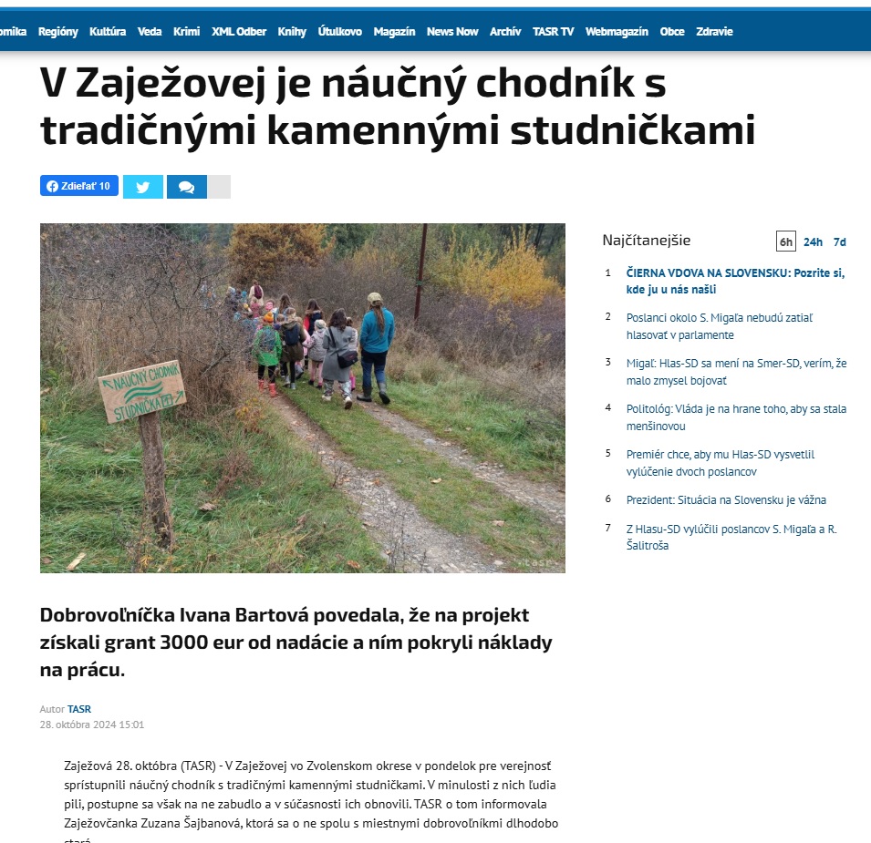 V dedinke Zaježová (okr. Zvolen) sprístupnili náučný chodník s tradičnými kamennými studničkami. V minulosti z nich ľudia pili, postupne sa však na ne zabudlo a v súčasnosti ich obnovili. Informovala o tom Zuzana Šajbanová, ktorá sa o ne spolu s miestnymi dobrovoľníkmi dlhodobo stará. Čítajte viac: https://www.cas.sk/clanok/2978407/kamenne-studnicky-nedaleko-zvolena-dostali-druhy-dych-k-lepsiemu-pristupu-k-vode-pomohlo-3-000-eur?orig_gallery_article=1
