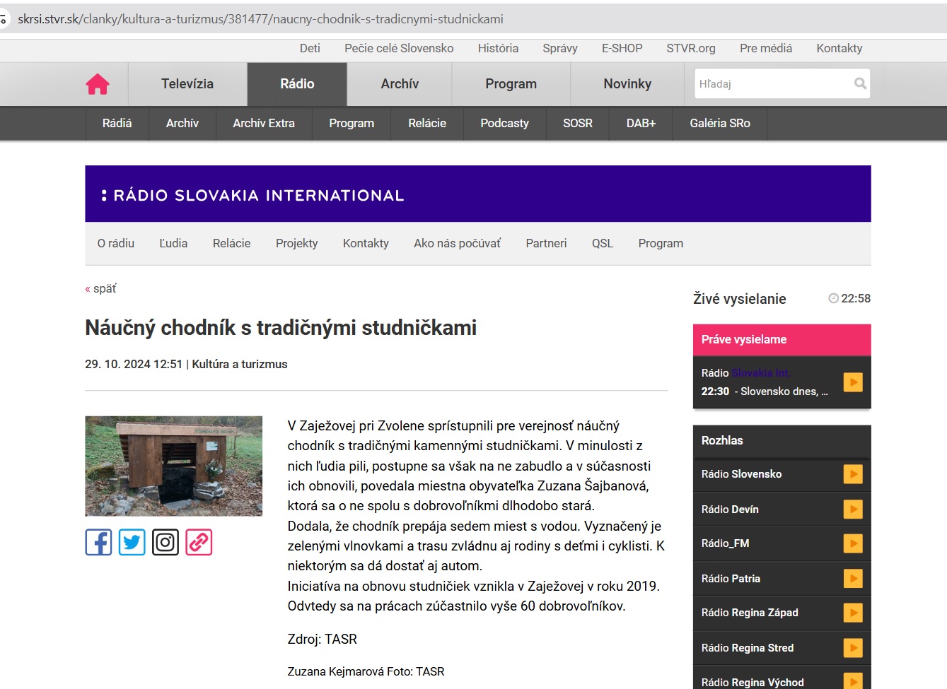 Zaježová 28. októbra (TASR) - V Zaježovej vo Zvolenskom okrese v pondelok pre verejnosť sprístupnili náučný chodník s tradičnými kamennými studničkami. V minulosti z nich ľudia pili, postupne sa však na ne zabudlo a v súčasnosti ich obnovili. TASR o tom informovala Zaježovčanka Zuzana Šajbanová, ktorá sa o ne spolu s miestnymi dobrovoľníkmi dlhodobo stará. Čítajte viac: https://www.teraz.sk/spravy/v-zajezovej-je-naucny-chodnik-s-tra/832453-clanok.html