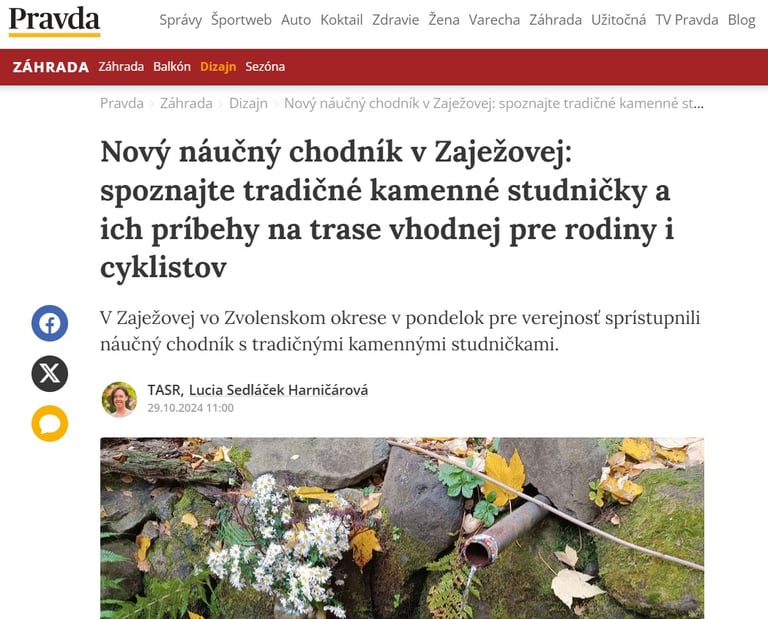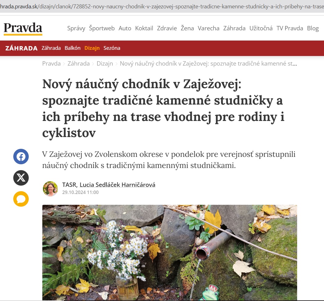 V Zaježovej vo Zvolenskom okrese v pondelok pre verejnosť sprístupnili náučný chodník s tradičnými kamennými studničkami. Čítajte viac: https://zahrada.pravda.sk/dizajn/clanok/728852-novy-naucny-chodnik-v-zajezovej-spoznajte-tradicne-kamenne-studnicky-a-ich-pribehy-na-trase-vhodnej-pre-rodiny-i-cyklistov/